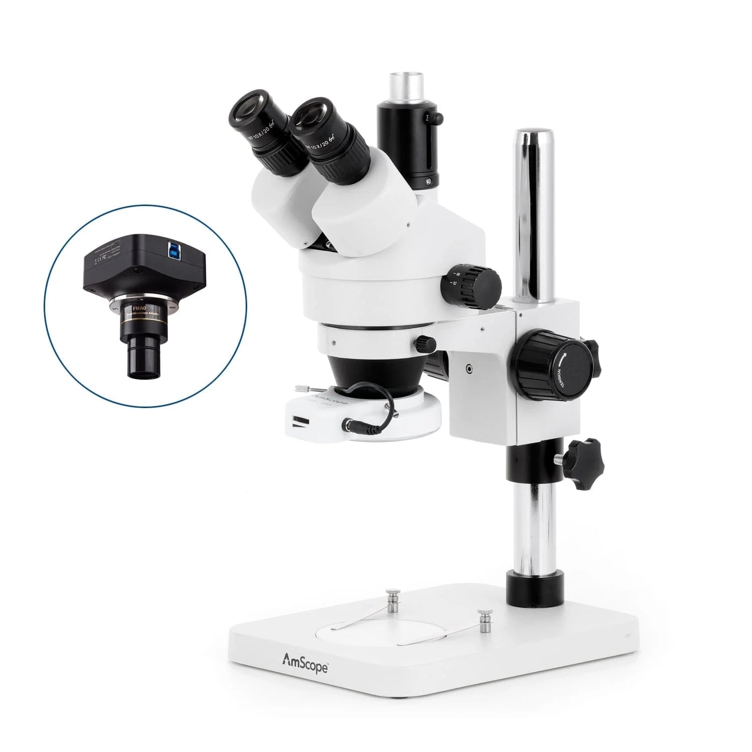 This is a trinocular stereo zoom microscope with a compact stand with 12" pillar. The stand's base has a small footprint to take up minimal space. The microscope incorporates all the most excellent features of a high quality laboratory instrument. Designed to meet the demands of modern microscopy applications, this microscope exceeds all expectations. It comes with SUPER widefield optics and basic table stand. This microscope offers high resolution and good depth within a broad field of view. It provides crystal clear sharp stereo images with a 4" (100mm) native working distance. Its 45 degree inclined ocular tubes ensure an easy observation and rubber eyeguards provide further comfort. Its trinocular port enables you to add photo or video capability.