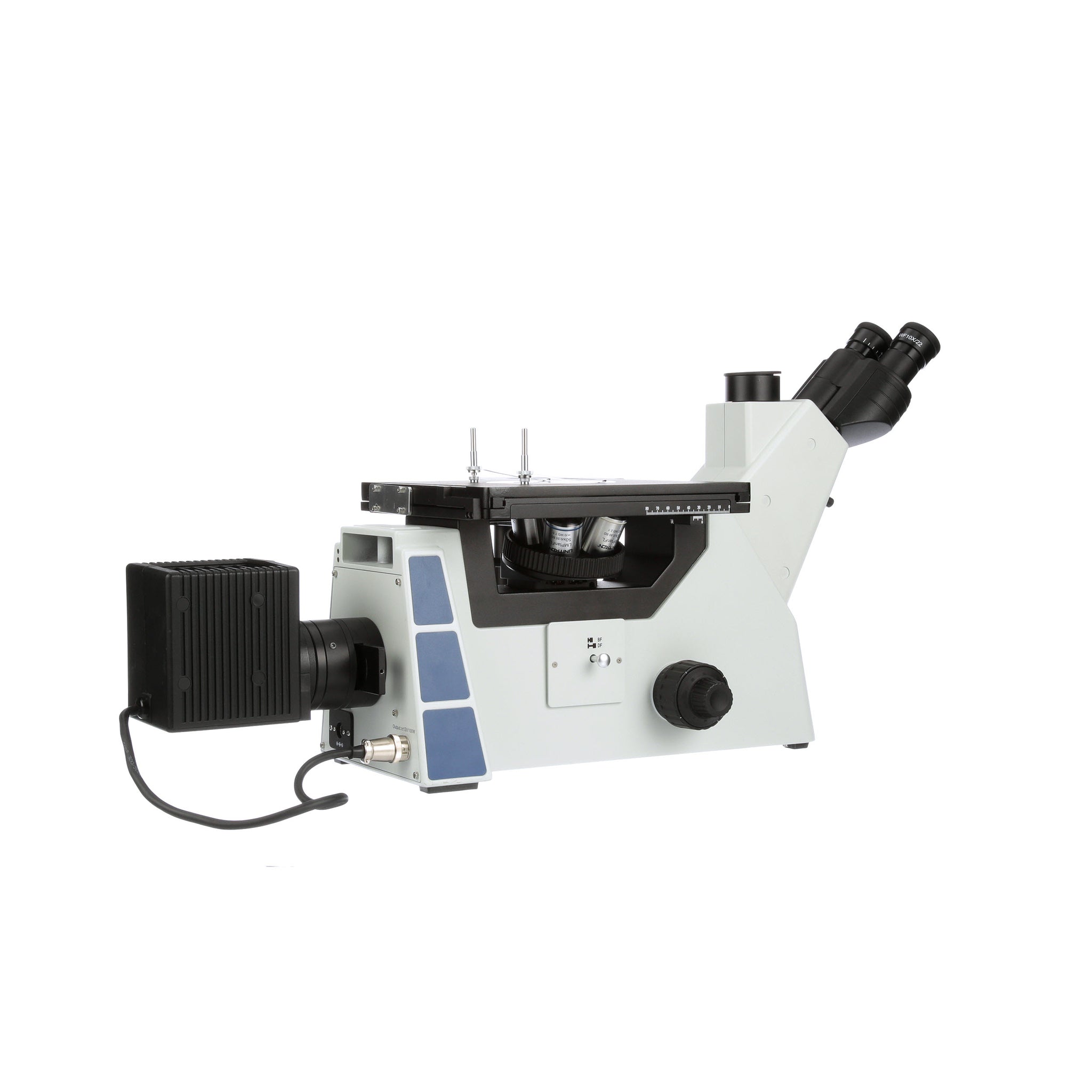 The Unitron Versamet 4 inverted metallurgical brightfield / darkfield DIC microscope is a solid robust microscope for metallurgy, smelt, heat treatment, raw material inspection, material processing, food safety evaluation, medical/clinical testing, and geological testing applications. This option is for the brightfield / darkfield DIC configuration. The microscope comes standard with a trinocular viewing head and 10x/22mm FOV eyepieces. Also included are infinity M LWD Plan Achromat Brightfield / Darkfield DIC 5x, 10x, 20x, and semi-apo 50x objectives. The microscope is quipped with an encoded nosepiece and an ECO infrared sensor which helps save energy turning the microscope light off when not in use. To help reduce glare and reflection a simple polarizer and analyzer are included. The microscopes comes with the matching DIC prisms for the objectives